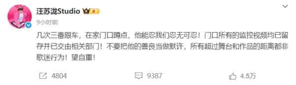 据悉,这已不是汪苏泷工作室第一次就私生行为发声。此前,6月18日,@汪苏泷Studio 曾发文怒斥:“几次三番跟车,在家门口蹲点,他能忍我们忍无可忍!门口所有的监控视频均已留存并已交由相关部门!不要把他的善良当做默许,所有超过舞台和作品的距离都非歌迷行为!望自重! ”