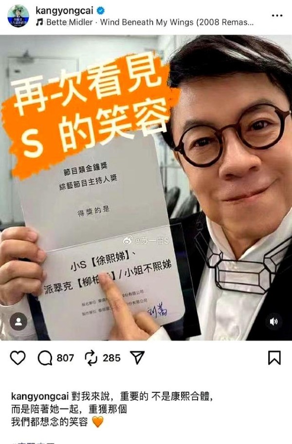 而蔡康永,明明早就宣布退休,不愿再出现在镜头前,却为了小S破例亲自站到金钟奖颁奖台,只希望能陪她一起重新面对舞台。