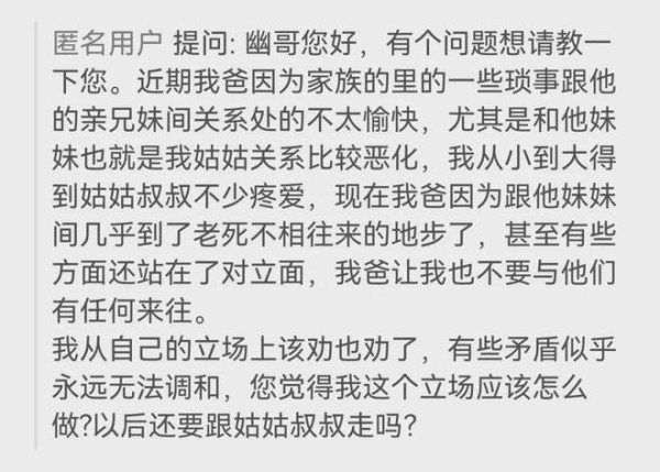 “幽哥您好,有个问题想请教一下您。近期我爸因为家族的里的一些琐事跟他的亲兄妹间关系处的不太愉快,尤其是和他妹妹也就是我姑姑关系比较恶化,”