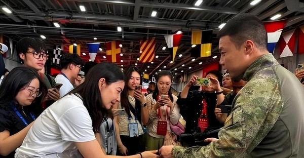 参观途中,年轻士兵们黝黑脸庞绽开笑容,一声声"嫂子"冲破海风。"郭姐,能合个影吗?"列兵李伟激动地递过相机,二十余名战士自觉列队。这些守护海疆的硬汉眼中闪烁的,是对世界冠军最纯粹的敬仰。