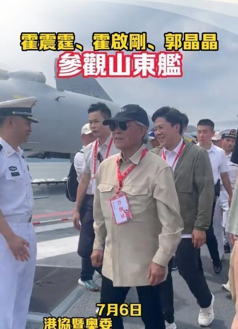 夏日的维多利亚港波光粼粼,一艘钢铁巨舰劈开浪涛驶入香港水域。甲板上,三位特殊访客的身影引得岸边市民翘首——霍震霆拄着拐杖精神矍铄,身后的霍启刚紧牵妻子郭晶晶,海风扬起她浅粉色帽檐下的碎发,那身简单的白T恤配牛仔裤,在国之重器的映衬下愈发耀眼。