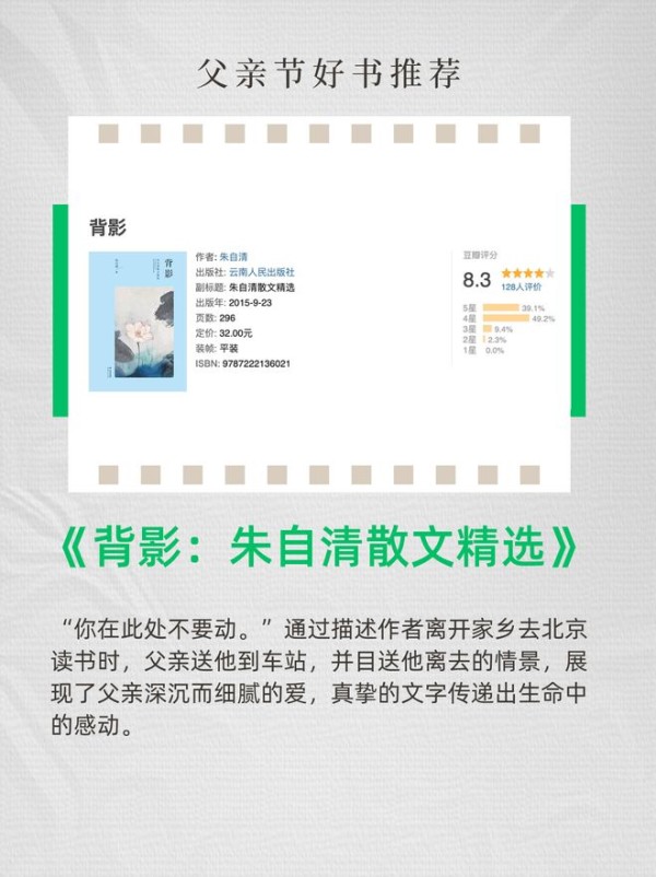 ✅《背影:朱自清散文精选》:“你在此处不要动。”通过描述作者离开家乡去北京读书时,父亲送他到车站,并目送他离去的情景,展现了父亲深沉而细腻的爱,真挚的文字传递出生命中的感动。