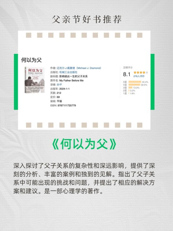 ✅《何以为父》:深入探讨了父子关系的复杂性和深远影响,提供了深刻的分析、丰富的案例和独到的见解。指出了父子关系中可能出现的挑战和问题,并提出了相应的解决方案和建议。是一部心理学的著作。