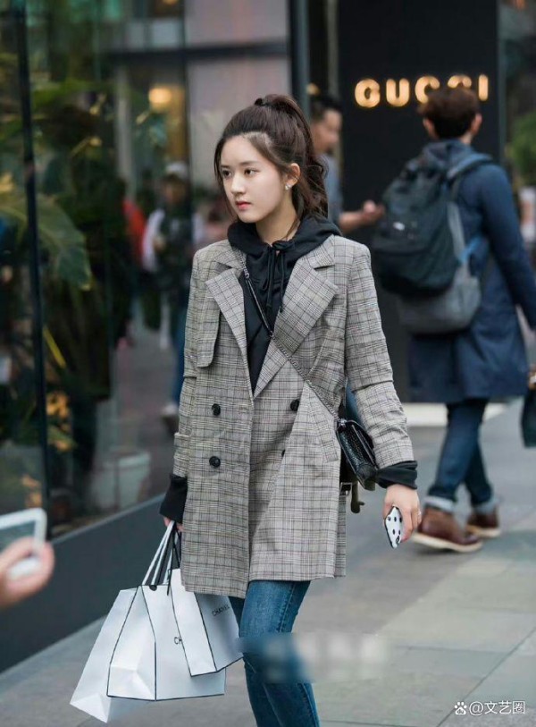 她穿着一件复古格纹长西装外套,内衬一件黑色卫衣,然而外套的皱巴巴质感让人不禁怀疑其品味。与外套不符的是,她手里拿着三大袋奢侈品,显示出强大的消费力。这一系列照片引发了人们对外表与内在、消费与价值观之间关系的深入思考。