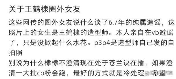 最后,粉丝还总结了一下王鹤棣有圈外女友这件事,并解释了王鹤棣为什么不澄清——