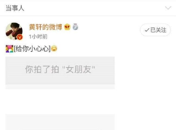 这不,黄轩在社交平台晒出了“你拍了拍你女朋友”的截图而公开示爱,并通过工作人员表示,女友是圈外人,希望大家不要打扰她。