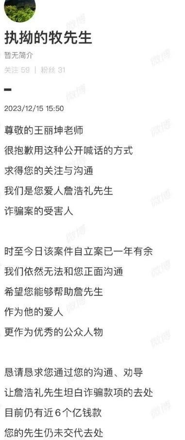 2023年12月15日,一位网友名为“执拗的牧先生”在微博上公布了正式的立案决定,指出王丽坤的伴侣詹浩礼涉嫌诈骗,并再次重申王丽坤及其妻子的无辜。