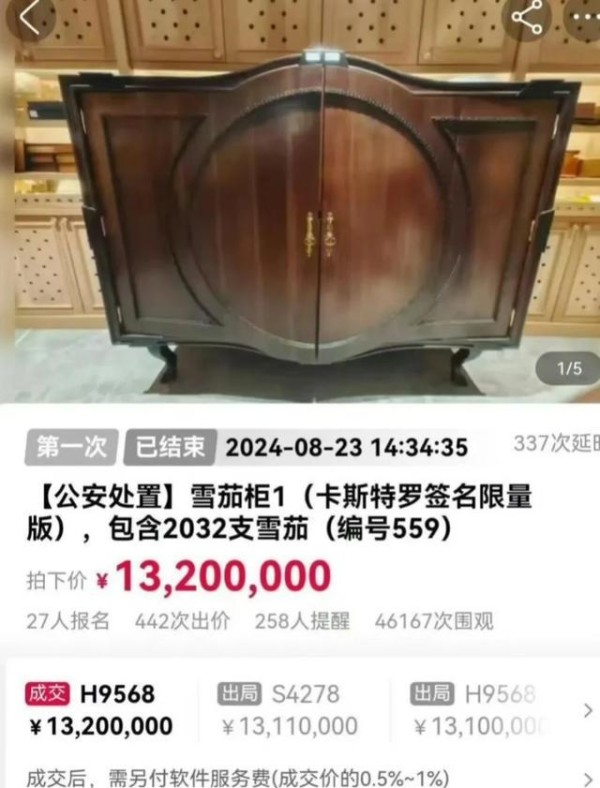 根据拍卖平台的数据显示,这批雪茄及其展示柜于8月22日启动拍卖,经过337次延迟和442次出价后,于8月23日下午2时34分结束,注册用户仅有27人,最终成交金额达到1320万元。