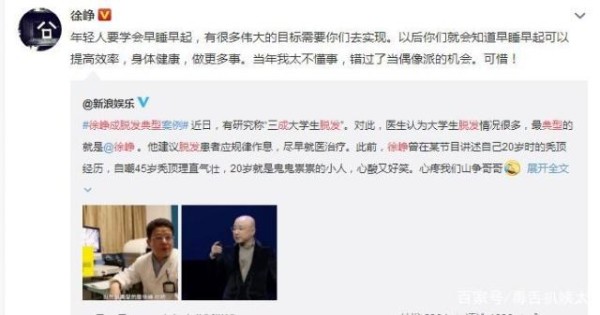 近日,有研究称“三成大学生脱发”。对此,医生认为大学生脱发情况很多,最典型的就是徐峥。5日,徐峥回应成脱发典型人物,并称:“年轻人要学会早睡早起,有很多伟大的目标需要你们去实现。以后你们就会知道早睡早起可以提高效率,身体健康,做更多事。当年我太不懂事,错过了当偶像派的机会。可惜!”错过了当偶像派的机会!”