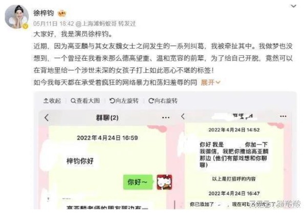 徐梓钧发文道歉,承认收钱但不代表接受高亚麟,晒聊天记录证清白