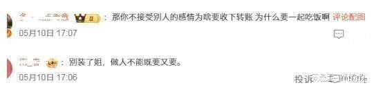 有网友说:那你不接受别人的感情为啥要收下转账,为什么要一起吃饭啊?