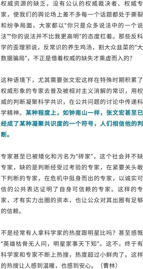 专家影响出圈没什么不好,专业问题与公共问题之间没有一个坚不可摧的壁垒,很多时候是紧密勾连在一起的,要专业的张文宏,也要出圈的张文宏,张文宏有责任在更多公共问题上发出科学和理性的声音。