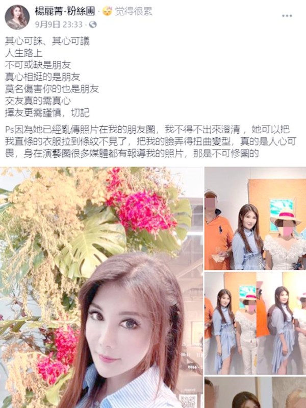 杨丽菁深知自己作为公众人物,肩负着维护良好形象的责任。面对此次恶意修图事件的严重干扰,她决定挺身而出,公开表达自己的立场。事实上,早在9月9日,杨丽菁就已公开发声,对那位闺蜜表示了强烈的不满。她坦言,在人生的旅途中,朋友是不可或缺的伴侣,但真心相待的朋友和那些无意中伤害你的朋友同样存在。因此,在选择朋友时必须谨慎,而维护良好的友谊则需要真心相待。特别指出的是,闺蜜在社交平台上随意发布她的不雅照片,这种行为确实令人不寒而栗。