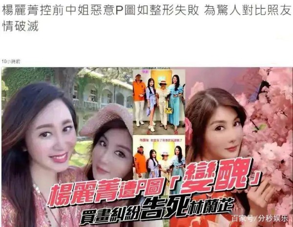 大千世界,无奇不有。近日有媒体爆料称,著名的女打星杨丽菁在失去挚友刘真后,新交好一闺蜜名唤林兰芷。两人如胶似漆、情同姐妹,经常一起出席活动、一起拍照。哪知,杨丽菁后来发现林兰芷在P两人的合照时,估计把自己P年轻,将她P丑之后,还发到了网上。她愤怒地说道:“本来原图是我比较漂亮的,脸看上去也是很自然的,但她发的照片就把自己修得很美很年轻,我就看起来跟整容失败一样。”