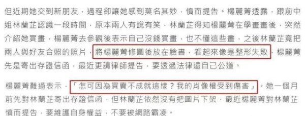 盛怒之下的杨丽菁直接对林兰芷提出控告,并下定决心“要将对方告破产”!她说林兰芷通过修图来丑化她,这样的行为跟黑粉没什么两样,还说是闺蜜呢。