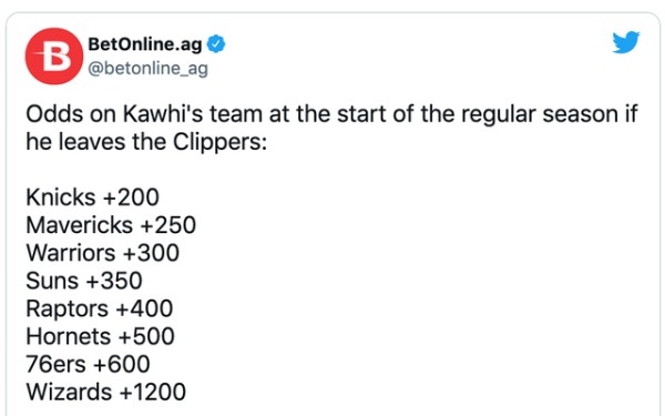 而热火完成补强后,美国媒体也是给伦纳德如果离开快船的潜在下家开出了赔率,现在遥遥领先的是纽约尼克斯、达拉斯独行侠和金州勇士。伦纳德加盟尼克斯的话,目的就只有一个了,那就是顶薪合同,但是毕竟自己只有31岁,难道真的不冲一冲总冠军了吗?独行侠不错,有潜力还有东契奇这样的球星,但是去独行侠难度可不小,本来独行侠送走理查德森后腾出了3300万的顶薪空间,但是随着执行考利斯坦的球员选项,独行侠大门关闭了。