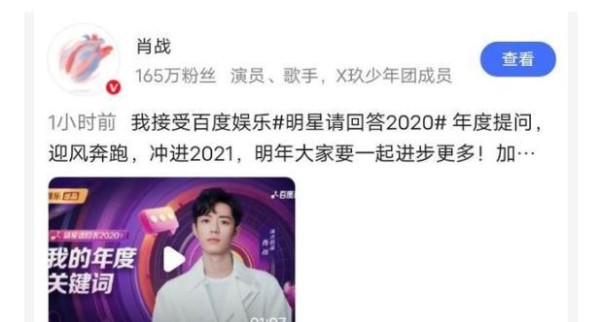 现如今,肖战此次接受百度的年度提问视频,便是在百度平台上发出。由肖战发出的视频,时长将近一分钟,内容是一问一答形式,给粉丝的看点十足,特别是镜头中肖战那令人熟悉的造型打扮。