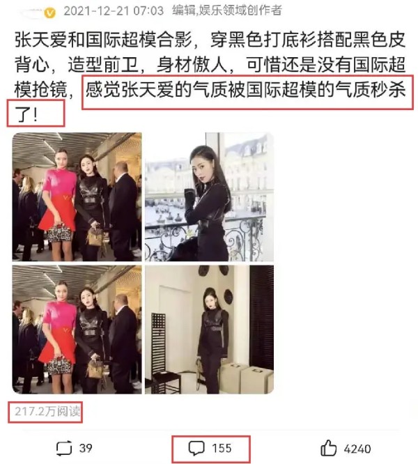 12月21日,有一位娱乐博主在网上晒出了一组张天爱和国际超模的合影,并配文“张天爱和国际超模合影,穿黑色打底衫搭配黑色皮背心,造型前卫,身材傲人,可惜还是没有国际超模抢镜,感觉张天爱的气质被国际超模的气质秒杀了!”不到1个小时阅读量超过了210万,网友评论数高达115条,很显然,张天爱和国际超模的合影火了,还引起了网友们的热议。