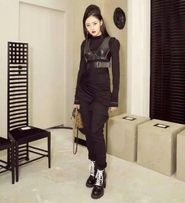从张天爱的造型来看,张天爱穿着一件黑色的打底衫,搭配了一件黑色的皮背心和一条黑色的裤子,脚上穿着一双黑色的高筒皮靴,手上还提着一个棕色的单肩包,穿衣搭配相当时尚,整个人也挺洋气,不过,张天爱的身材优势和气质优势没有被发挥出来,气质显得有点大众化了。
