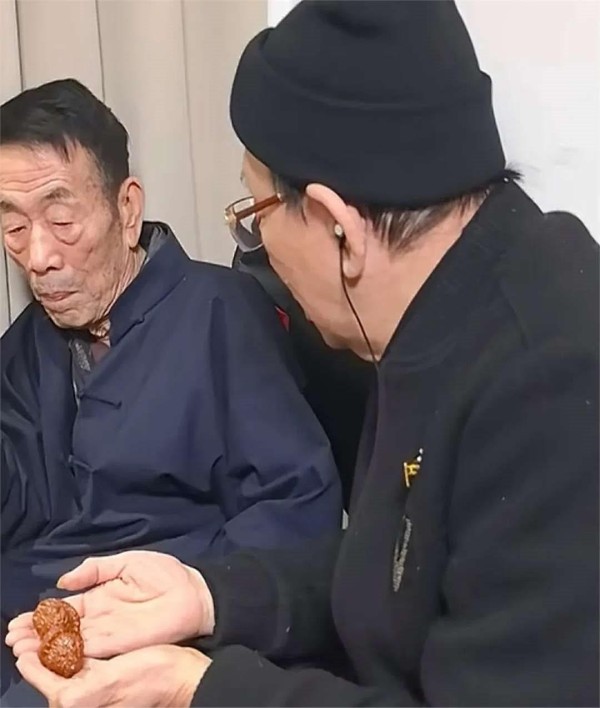 他不时用纸巾擦拭着眼睛,见到访者而感到欣慰。随即把多年来精心雕刻的核桃赠予对方,对杨而言这礼物意义非凡。两人的关系可见深厚。 尽管猴年岁已高,在杨面前依旧谦逊有礼。