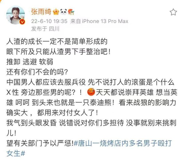 #张雨绮为唐山打人事件发声#