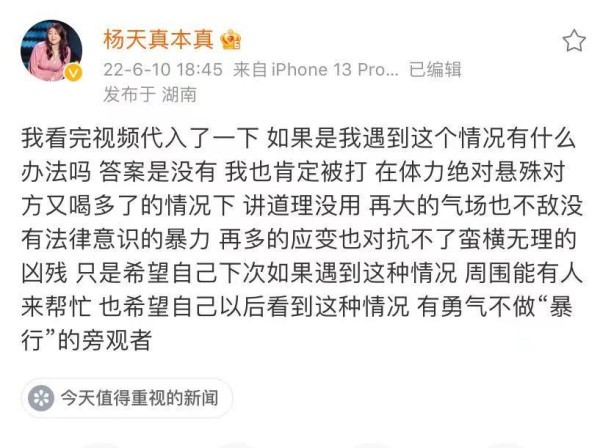 杨天真的发文是,看完视频代入了一下,如果自己遇到这个情况会有什么办法,自己肯定也被打,在体力绝对悬殊和喝多了的情况下,讲道理没用,再大的气场也不敌没有法律意识的暴力,再多的应变也对抗不了蛮横无理的凶残,只是希望自己下次如果遇到这种情况,周围能有人帮忙,也希望自己以后看到这种情况,有勇气不做“暴行”的旁观者。