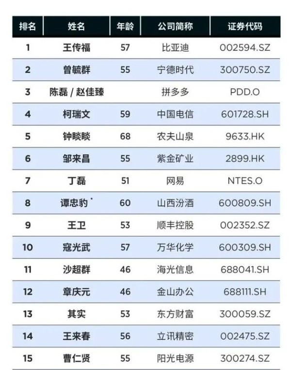 近日,2023年福布斯中国最佳CEO榜单正式公布,根据榜单显示,今年跻身前十的CEO大多都是大家熟悉的老面孔,比如比亚迪的王传福就排到第一名,宁德时代的曾毓群排名第二,而拼多多的陈磊/赵佳臻则排名第三,还有就是农夫山泉的钟睒睒、网易的丁磊则分别位居第五名和第七名,这些CEO都在各自的领域都取得了相当卓越的商业成就,他们的一举一动都备受关注。