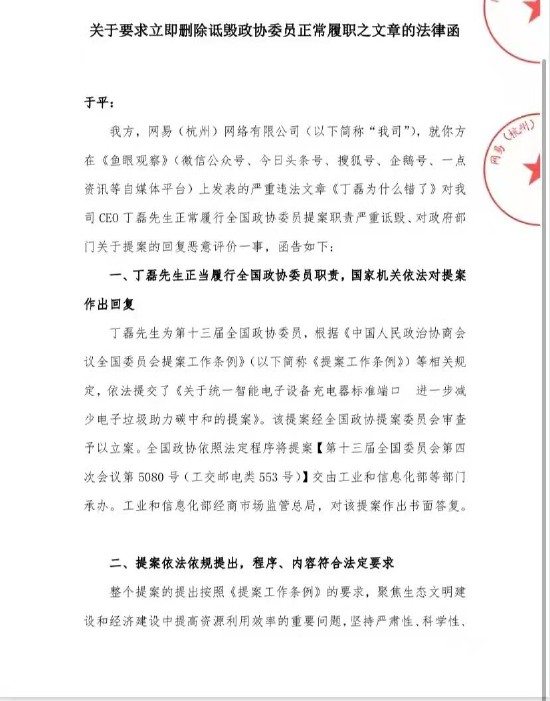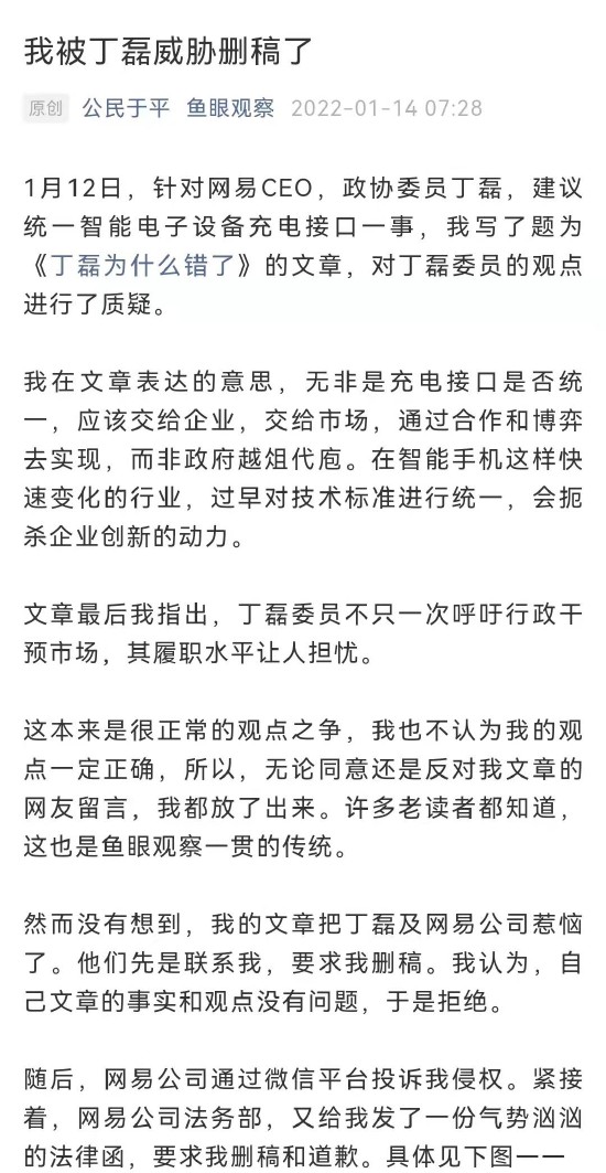 1月12日,一公众号发文《丁磊为什么错了》,反对网易CEO丁磊对于“统一智能电子设备充电器标准端口”的建议,文章最后一句评价其“水平令人担忧”。