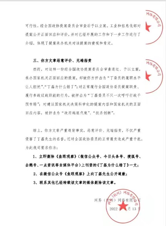 实际上,关于这一观点,在网络一直都有讨论。网易方面觉得,如果就事论事,客观的讨论没有问题,但问题就出在文章的最后一句,评价了丁磊的能力。在私下删稿沟通无果后,网易法务部门才发出了这样一封使用了“诋毁”等严厉措辞的函件。