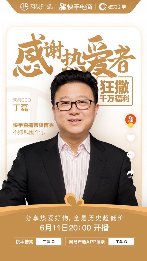 据消息称,网易CEO丁磊已确定于6月11日在快手和网易严选APP进行首次直播,而刚在快手直播拿下1.74亿成交额的知名快嘴华少也将加入丁磊直播首秀,担当主持。