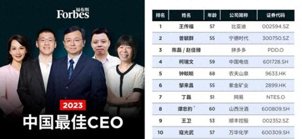 在今年7月份之际,福布斯中国正式发布了最新的“2023中国最佳CEO榜”,具体名单更是引来了广泛的关注。能看到,比亚迪CEO王传福蝉联着榜首位置,他带领着比亚迪实现翻倍增长收入与破百亿人民币净利润的成绩很有说服力。前十名单里分别有宁德时代的曾毓群、拼多多的陈磊/赵佳臻、中国电信的柯瑞文、农夫山泉的钟睒睒、紫金矿业的邹来昌、网易的丁磊、山西汾酒的谭忠豹、顺丰控股的王卫,以及万华化学的寇光武。