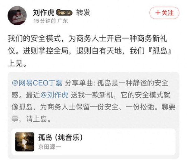 然而有意思的是,鲜少发表言论的丁磊,近期在网易云音乐平台上所分享的一则动态却引起了网友们的热烈关注,甚至还得到了OPPO首席产品官刘作虎的回应。从文案内容可以推断出,丁磊似乎已经提前用上了OPPO尚未发布的新折叠屏手机Find N3,而且相当认可手机的“安全模式”表现,直言“为商务人士保留一份安全、一份松弛。聊要事,请上岛”。
