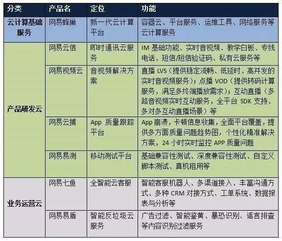 产品研发:主要服务于企业的产品研发,包括移动端、多媒体、服务端、前端、信息安全、运维保障等。目前网易已经推出的产品研发云有网易云信、网易视频云、网易易测、网易云捕等。