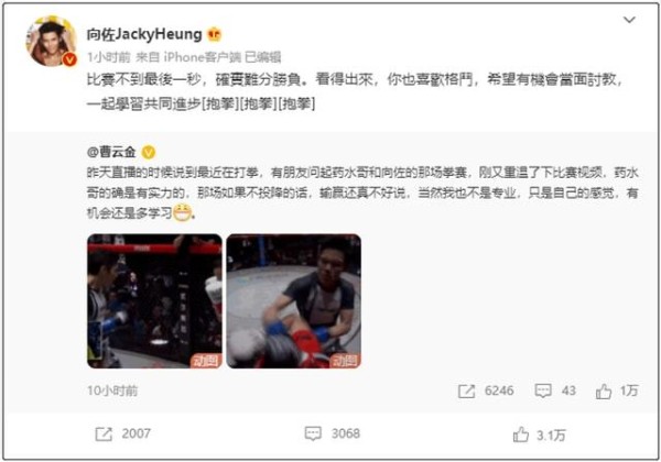 而在之后,曹云金又一次发文回复了这个问题,他觉得药水哥很有实力,如果药水哥不投降,输赢还真不好说。这样的话题无非就是在内涵暗示向佐不行,是药水哥让步了所以才赢了。而这一言论就得到了向佐本人的回复,向佐直言:比赛不到最后一秒,确实胜负难分,看得出来你们也喜欢格斗,希望有机会当面讨教,一起学习共同进步。向佐的回复还是比较高情商的。