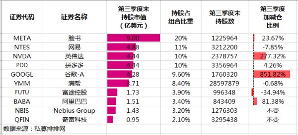 相关公开持仓信息显示,截至2025年第三季度末,景林资产在美股市场重点持有近30家上市公司。前十大重仓股为:脸书、网易、英伟达、拼多多、谷歌-A、满帮、富途控股、阿里巴巴、Nebius Group和奇富科技。