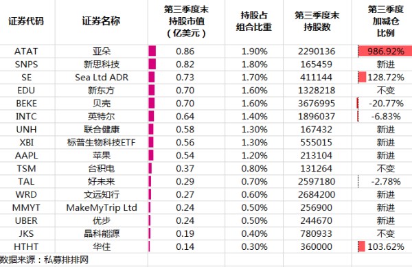 在中概股方面,景林资产第三季度买入文远知行,截至第三季度末的持股市值为0.27亿美元。此外,第三季度,景林资产还加仓了国内酒店行业的龙头公司亚朵,并以0.86亿美元的持股市值,排名其第十一大重仓股。