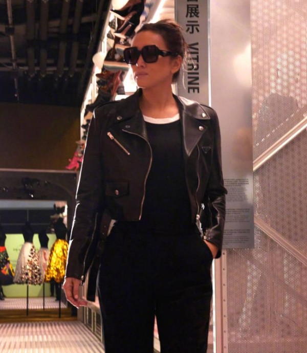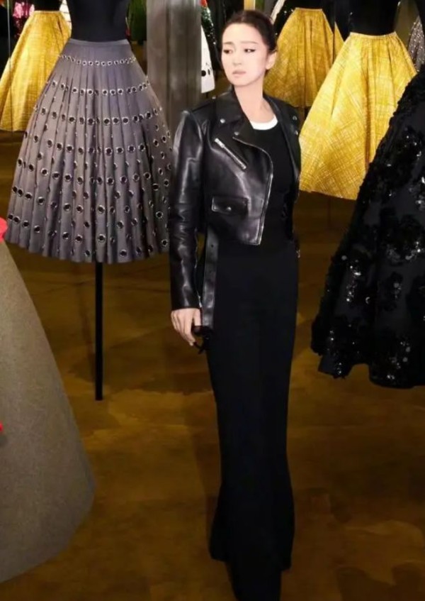 一身黑的搭配在颜色上实现了和谐统一,使整体造型显得干净利落。短款皮衣、高腰阔腿裤和配饰的黑色统一感,展示了整体造型的一致性,呈现了整体搭配的和谐之美。单色调的搭配有助于视觉的延伸,使整体造型显得更为修长。这对于巩俐这样的女性明星来说,有助于展现身形的纤细与高挑感,使她看起来更加修长挺拔。
