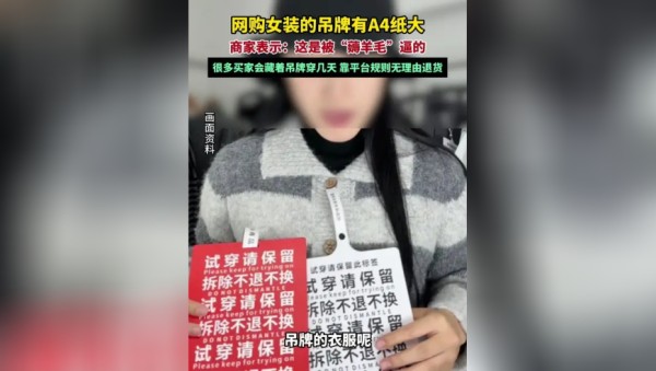 网购女装的吊牌有A4纸大!是新设计还是搞抽象?商家表示:这类吊牌是专门防恶意退货的,原来,很多买家会藏着吊牌穿几天,甚至穿去约会、参加活动,再以“不影响二次销售”为由申请退货,靠七天无理由规则恶意 “薅羊毛”