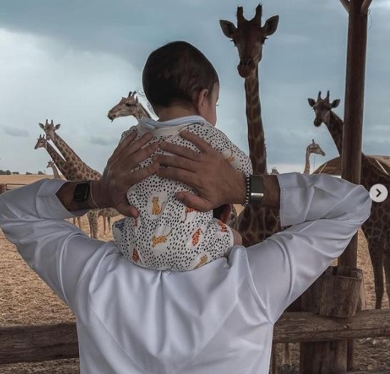 哈曼丹父子好有爱,小太子骑在父亲肩膀上,挥手跟长颈鹿打招呼