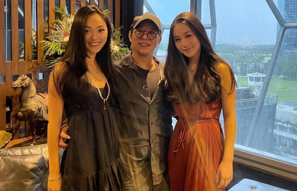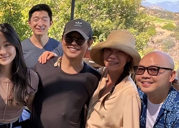 合影照中展现了李连杰、杨紫琼以及他们的小女儿Jada,还有两位男性朋友。所有人都面带着灿烂的笑容,心情十分愉快。