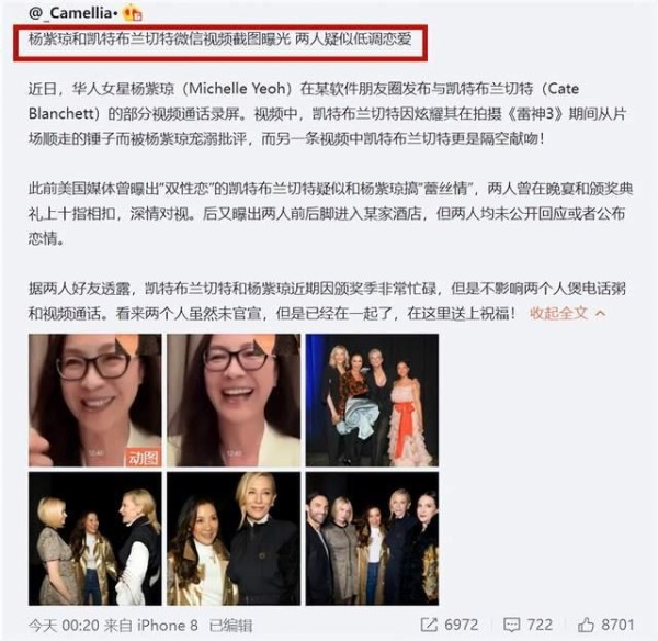 如果说手牵手可能是正常好朋友,视频通话也可能只是闺蜜情,但是因为大家都知道凯特·布兰切特是双性恋,也喜欢女生,这就不禁令人浮想联翩了。要知道,杨紫琼已经结婚,家中是有老公的。