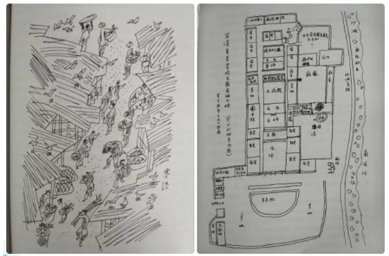 黄永玉根据回忆画出的集美岑头街场景、安溪集美学校文庙安排大略。(来源:集美大学)