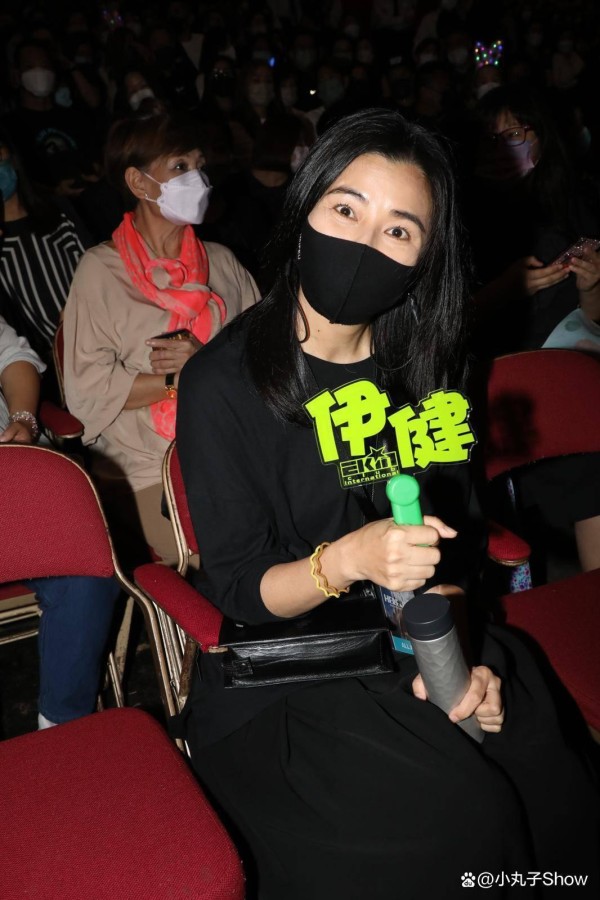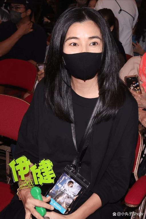 49岁的蒙嘉慧好像老公的小迷妹一样,手持郑伊健的灯牌加油应援,一身黑衣打扮十分低调,极简主义的风格显得休闲大气。虽然脸上戴口罩,但是露出来的肌肤白皙紧致,眉眼精致,气质一如既往地出挑。