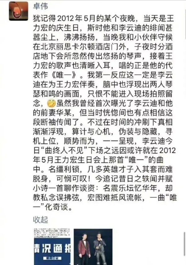 非著名娱评人吴清功指出:卓伟在10月23日发朋友圈,表示王力宏和李云迪的是假的,有人在炒作——算计与心机,伪装与隐藏。虽然卓伟没有说李云迪炒作,但不可能是王力宏炒作,王力宏毕竟结婚了,孩子都有3个了。