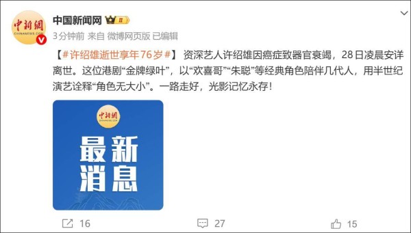 许绍雄的离世,无疑是香港演艺界的一大损失,也让无数观众感到惋惜。TVB官方已发文致哀,社会各界也通过各种方式表达了对这位老戏骨的敬意与怀念。他生前最后一条社交媒体动态发布于2025年10月10日,内容为分享人生感悟,状态积极,未显露病容,这更让人感叹世事无常,也展现了他豁达积极的人生观。他曾说“演戏是生命寄托”,这份对事业的执着,直至生命尽头都未曾改变。即使在2025年,他仍有《绝命法官》《家族荣耀之继承者》等多部作品与观众见面,其敬业精神令人动容。他用一生证明,真正的艺术家,永远在路上。