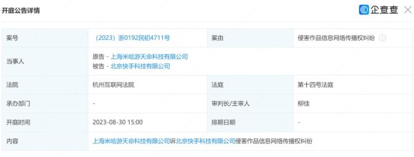 企查查显示,上海米哈游天命科技有限公司(以下简称“米哈游”)于近日新增一则开庭公告,被告为北京快手科技有限公司,案由为侵害作品信息网络传播权纠纷,该案将于8月30日在杭州互联网法院开庭审理。