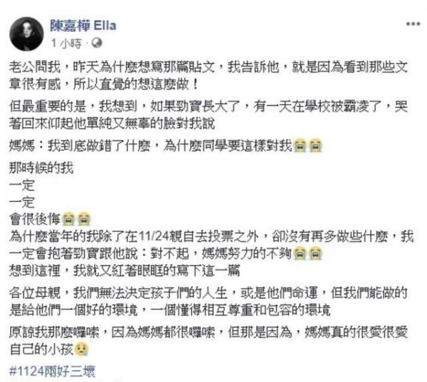 还有一点就是因为家庭或者受到伤害的原因,因此Ella力挺同婚是希望给孩子创造一个更加和谐,更加包容的环境,她不希望将来孩子因为喜欢而被骂被孤立,可以说,Ella体现的,是一个真实的母亲的角色。