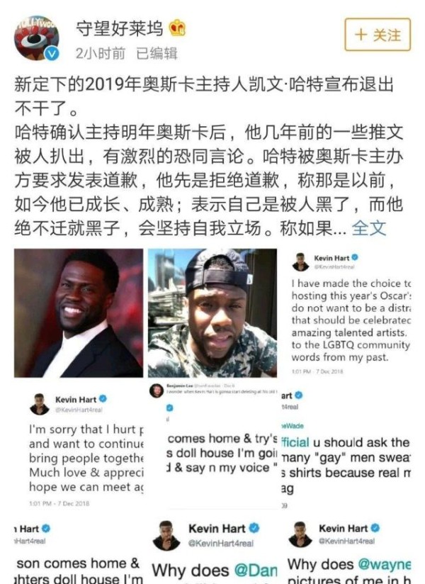 黑人明星凯文·哈特辞去奥斯卡主持 因不友好言论奥斯卡最佳女主角弗朗西斯:握手可以,拒绝拍照
