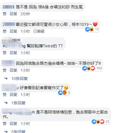 旧爱与“绯闻新欢”的合作,让很多人猜测是在与阿信隔空对话,网友的评论也是一致都是在聊“说好不哭”,还问她道:“是不是,因为信&伦合唱没约你,而生气”、“因为阿信跑去和杰伦合唱吗?哈哈,不跟你好了”、“是不是阿信移情别恋,跑去跟哥中之歌合作”。