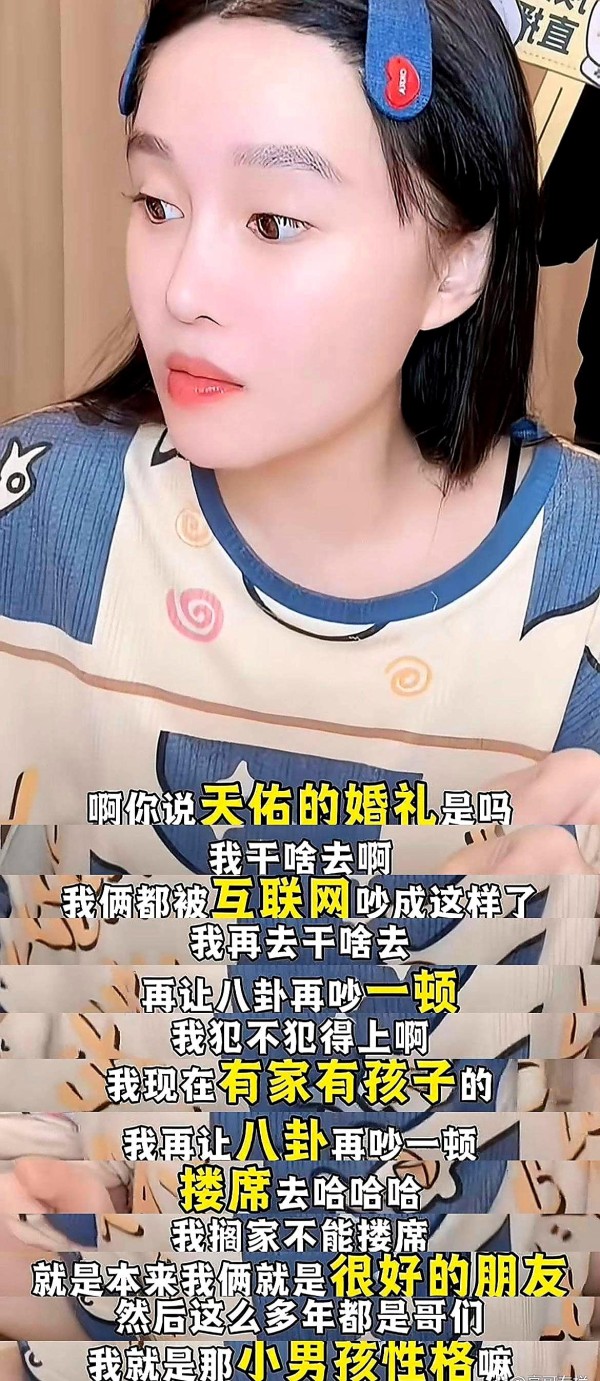 不过,大家最感兴趣的还是球球和天佑之间的故事。每次提到他们,评论区总能炸出一堆“绯闻”,什么“球球被天佑辜负”“赵本山封杀天佑”这些说法在网络上传播得特别广。但球球最近在直播间的回应,真的把所有狗血剧情都击碎了。她一边笑着,一边用很轻松的语气说:“你们说我去天佑婚礼干啥,再给八卦添点料吗?我现在有家有孩子,不能再搅和这些事。”她还特别强调,自己和天佑就是哥们,压根没有那么多复杂的感情线。不得不说,球球的情商是真的高,不光把问题化解了,还让大家看清了事实。